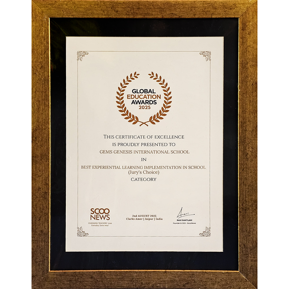 We are delighted to share that Gems Genesis International School (GGIS) has been awarded the Best Experiential Learning Implementation in School (Jury’s Choice) at the prestigious Global Education Awards 2025.